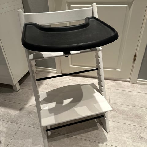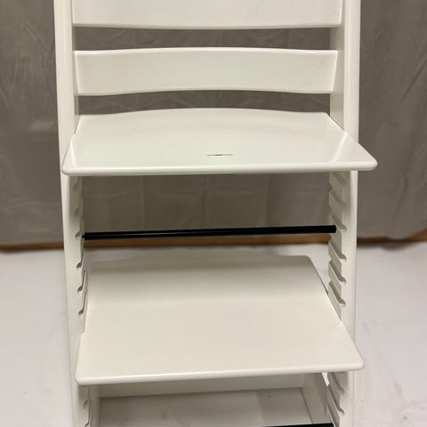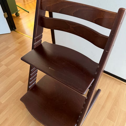 Stokke høy barnestol i tremateriale med justerbare trinn for tilpasning til barnets størrelse. Stolen har et sete med mønstret pute og sikkerhetssele for barn.