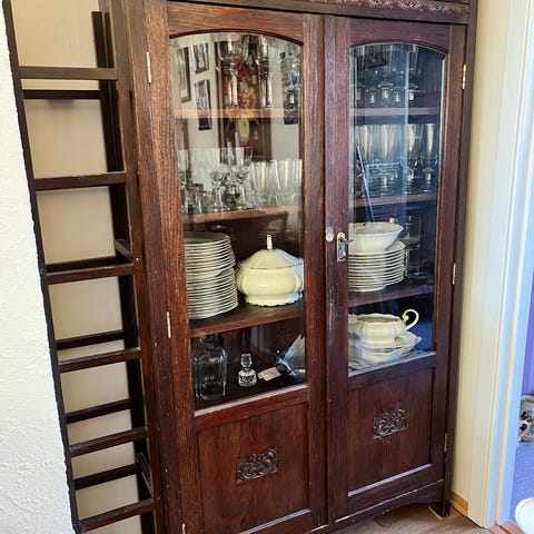 Flott gammelt skap i tre med nydelige utskjæringer og hengsler. Noe brukspatina på toppflate, ellers i god stand.