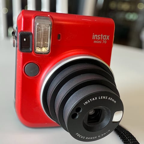 Selger mitt kule Instax SQ 1 kamera i oransje farge.