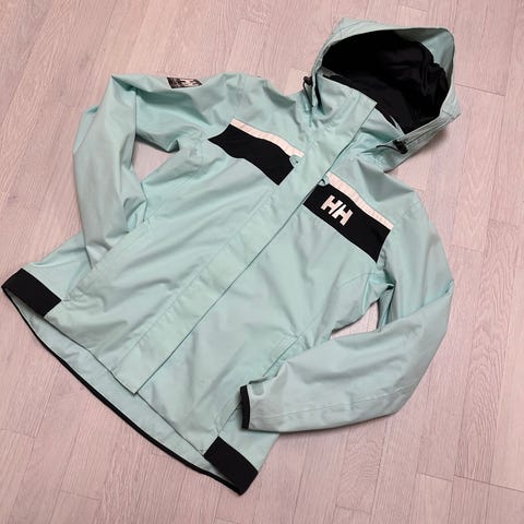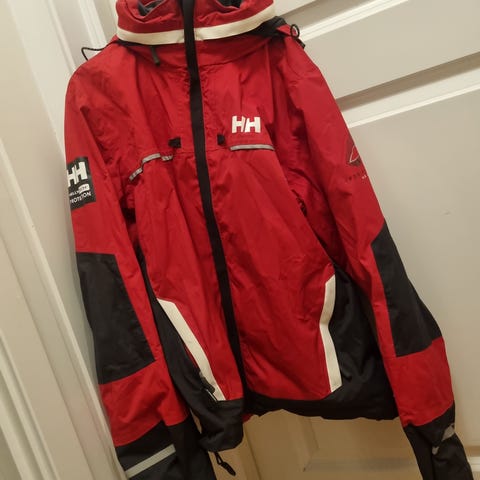 Vintage seilerjakke fra Helly Hansen - vendbar, mørk blå og grønn. Glidelås + knapper. Hette inne i kragen. På den blå siden er det stikklommer med glidelås. På den grønne siden er det lommer med klaff. Brystbredde målt fra under ermet er 130 cm. Lengde fra hals/skulder er 82 cm.