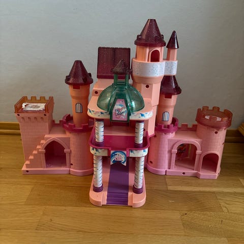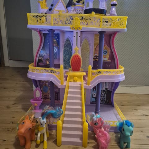 My Little Pony lekeslott for barn med flere tårn og en trapp. Slottet er designet i rosa, lilla og gullfarger, laget i plastmateriale. Passer for barn som liker rollelek og fantasifulle leker.