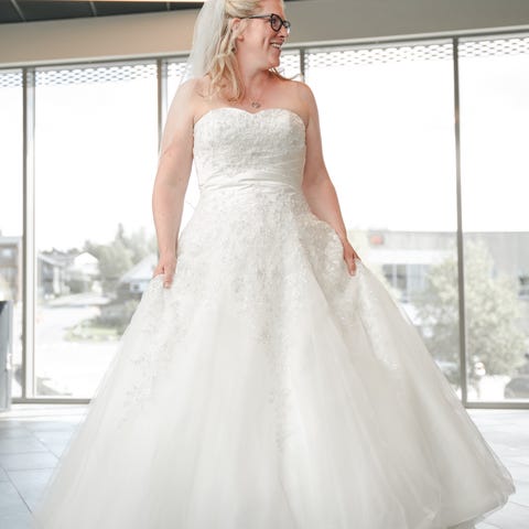 Den har « 3 looks» i en. Den kan ha offshoulder med erme, kun off shoulder og man kan ta av offshoulder. Alt er festet med trykknapper, så det kan lett taes av og justere på dagen 👰