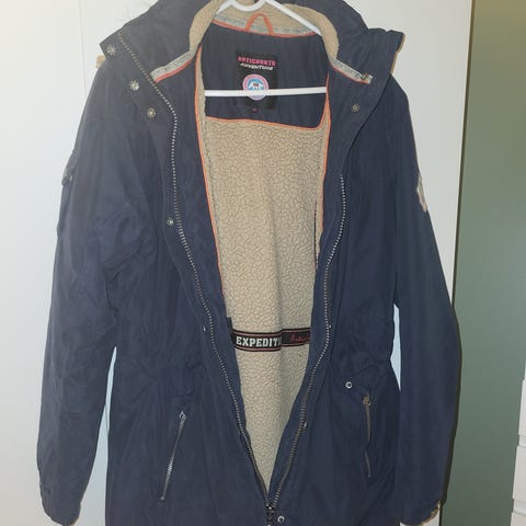 Står strl 42 men passer for M for kvinner. Jakken er blå og laget av dun, som gir god isolasjon og varme. Passer til kaldt vær og vinterbruk.