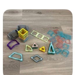 Geomag magnetisk konstruksjonsleke sett bestående av fargede plaststaver, magnetiske metallkuler og fargede plastpaneler i forskjellige former. Settet er laget for konstruksjonslek og utvikling av romforståelse.
