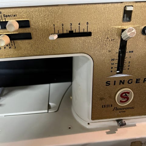 Selger en vintage Singer symaskin i klassisk beige utførelse. Dette er en solid og tung maskin fra en tid da kvalitet og holdbarhet sto i fokus.