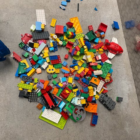 Masse duplo selges. Flere brett, tak, vegger, klosser, tog med bane, søppelbil med søppelkasser, mennesker, noen dyr, noe her har vært (og kan igjen bli) kan bli en brannstasjon, brannbil, romskip, helikopter, fly, traktorer, biler +++ (ligger lag på lag på bildet)