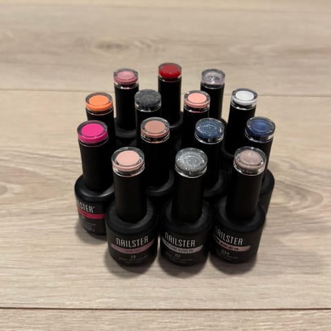 7 flotte farger. Fint å prøve før man kjøper nytt sett. Mye igjen. Var litt uheldig med den ene flaska, hadde ikke skrudd skikkelig igjen, lakk litt, men fortsatt mye igjen, halve flaska.