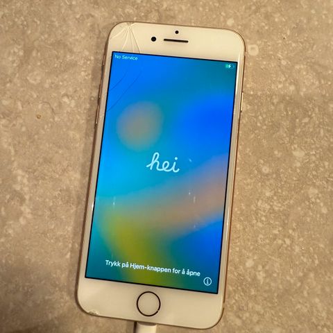 Apple iPhone 8 smarttelefon med 64 GB lagringskapasitet. Enheten har svart farge og er utstyrt med en fysisk hjemknapp. Batteriets maksimale kapasitet er 79 %, noe som kan påvirke batterilevetiden. Telefonen har riper og en sprekk på skjermen, som vist på bildene.