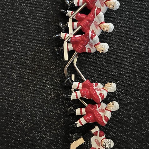 MP Sports Airhockeybord med pucker og køller. Bordet har en overflate med hvit og rød design, og ben i svart materiale. Egnet for innendørs bruk som spillbord for luft-hockey.
