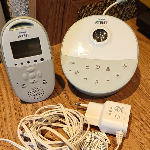 Avent babycall. Enheten består av en sender og en mottaker med kontrollfunksjoner. Designet for overvåkning av babyer i hjemmet mv.