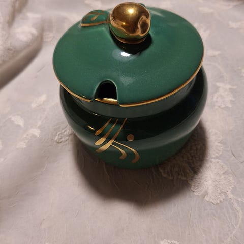 Eldre sukkerskål fra Egersund fajanse. Stempelet ble brukt frem til 50-tallet. Skålen mangler dessverre lokk.