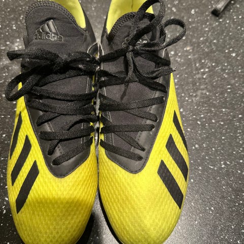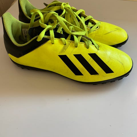 Adidas fotballsko : fargen grønn med svarte detaljer. Skoene har snøring og er laget for bruk på fotballbanen.