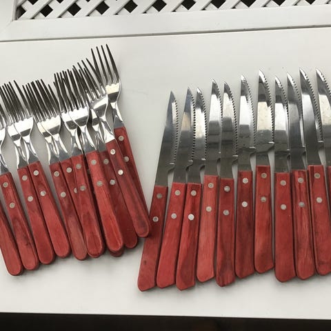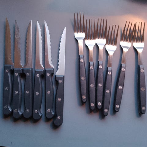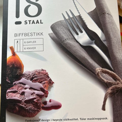 Bestikk Biff-bestikk sett med 12 deler, inkludert 6 kniver og 6 gafler. Bestikket er laget av stål og har bakelitt skaft. Designet for bruk ved måltider med biff og lignende retter.
