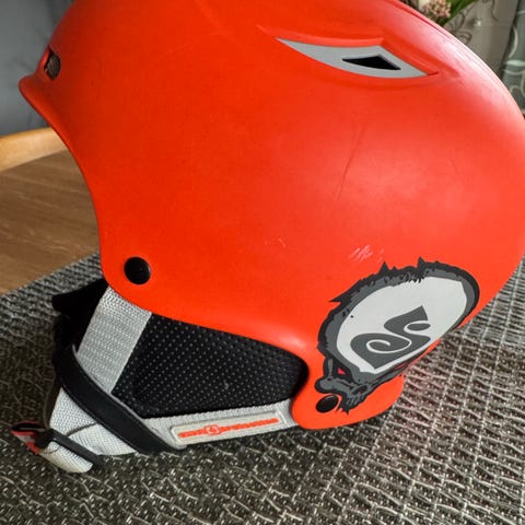Spy Ski- og snowboardhjelm i rød og svart farge. Hjelmen har integrerte briller med stropp for feste. Egnet for vintersportaktiviteter som ski og snowboard.