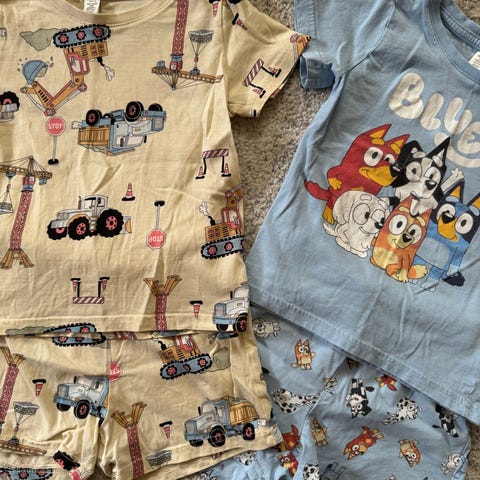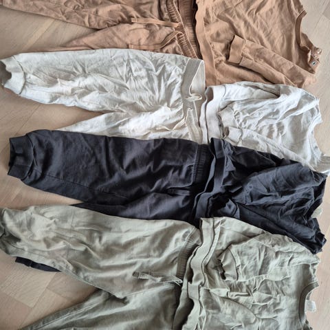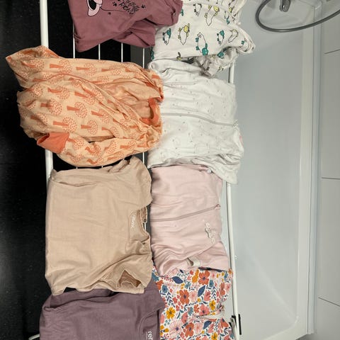 Stor Pysjpakke med 12 pysjer. 5 med lange bein/armer. 7 med korte armer/bein. Noen få flekker 1 pysj har hull ved glidelåsen