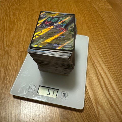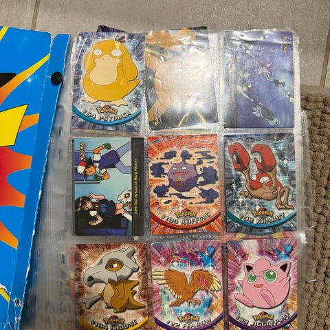 Samling av diverse Pokemon kortspillkort i ulike utgaver og tilstander. Kortene varierer i motiv og farger, og kan brukes til samling eller spill.