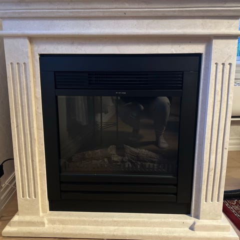 Elektrisk peis i hvitt treverk med dekorative detaljer. Passer til innendørs bruk for å skape en koselig atmosfære uten behov for ved eller skorstein.