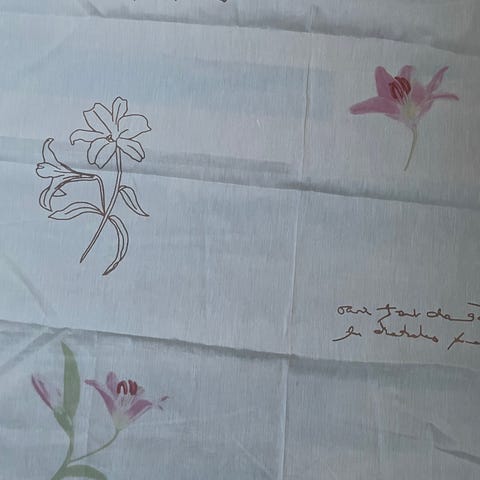 Helt nytt stoff fra eksklusive JAB Tekstil.Fra 90 tallet. Str ca 135 cm x ca 115 Stoffet er litt støvskittent i brettekant. Har vært med på div flyttinger og oppbevart i forskjellige skuffer og skap. Har ikke forsøkt å vaske det , men regner med at det lett lar seg fjerne ved vask . Stoffet er chinset, dvs lett skinnende.