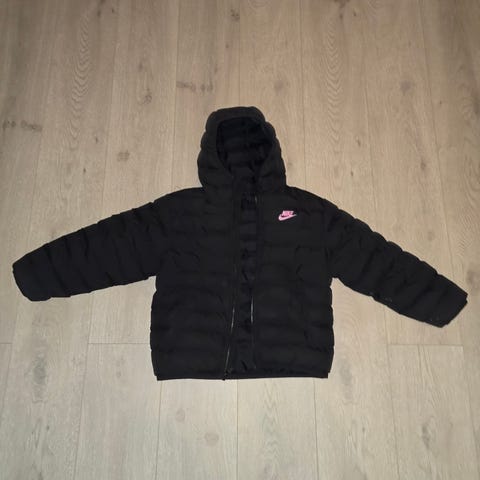 Nike jakke i svart for barn jente, størrelse 140. Jakken har hette med pelskant og er designet for å gi varme og beskyttelse mot vær.