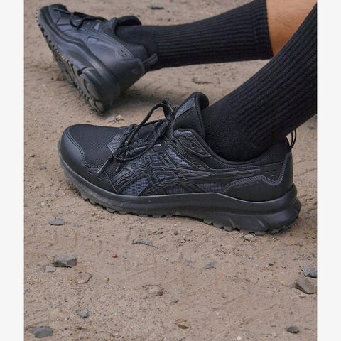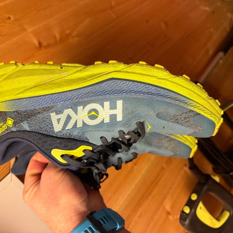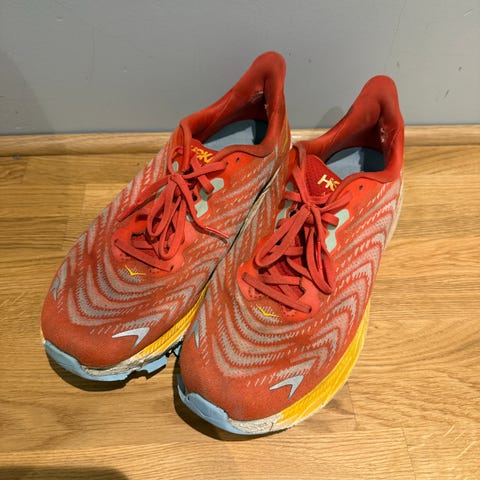 Hoka løpesko i størrelse 44, designet for løping. Skoene har en svart overdel med oransje detaljer og en lys såle. De er laget for å gi støtte og komfort under løpeaktiviteter.