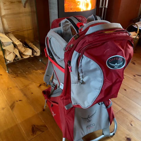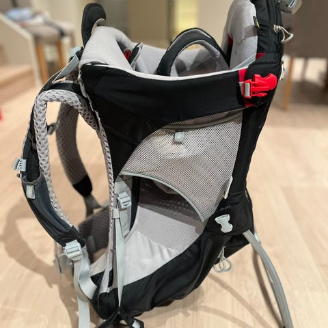 Osprey Poco AG er en bæremeis med integrert solskjerm og regntrekk. Den har justerbare stropper og polstret ryggstøtte for komfort.