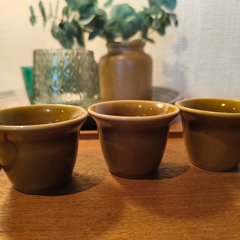 5 stk hvorav 2 er krakelerte, den ene med en sprekk i bunnen.