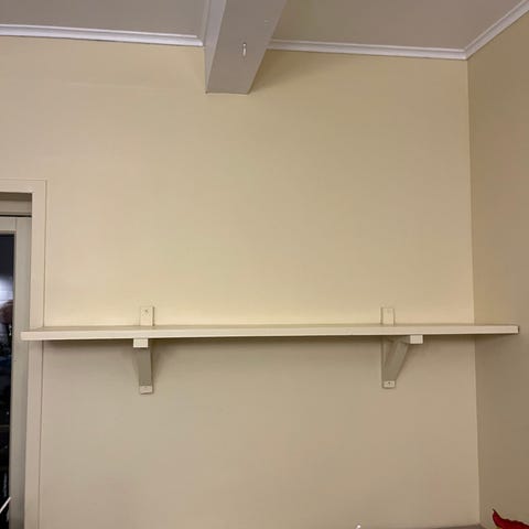 Godt og synlig brukt hylle. Usikker på merke. Lys trefarge. Flekket både her og der, og fronten i bunn er oppskrapet.