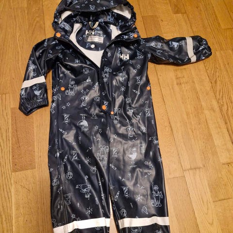 Helly Hansen regndress 86, den er ganske stor i størrelsen og kan brukes lenger. Den har flis inne så den er ganske varm og myk. Det er et lite slitemerke under rumpa, se siste bilde, men ellers helt fin.