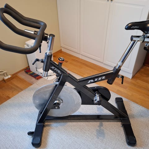 Velfungerende spinningsykkel av typen Xspinn X200, med digital skjerm som viser tid, hastighet og distanse. Sykkelen har justerbart sete og styre for tilpasning til brukerens høyde. Pedaler med reimer.