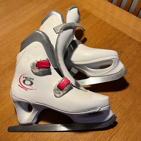 Chaya Kunstløpsskøyter/Danseskøyter i størrelse 38. (De er litt små i str, så kanskje 37,5) Skøytene har hvit og lilla farge med detaljer i mintgrønn. Fôret inni. Egnet for generell skøyting.