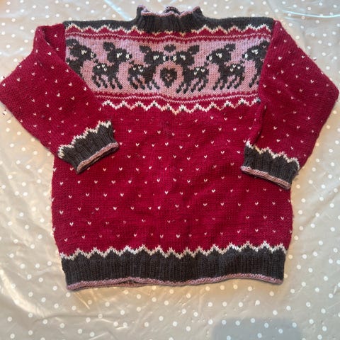 Nydelig brun Villmarksgenser til barn strikket i merinoull selges.