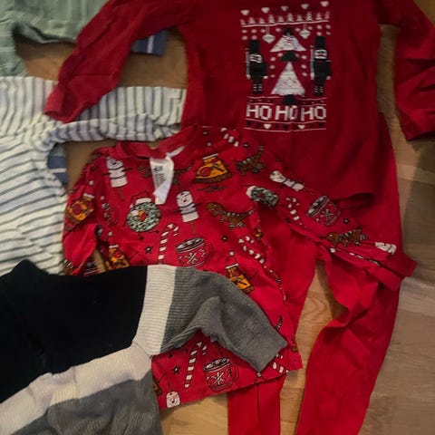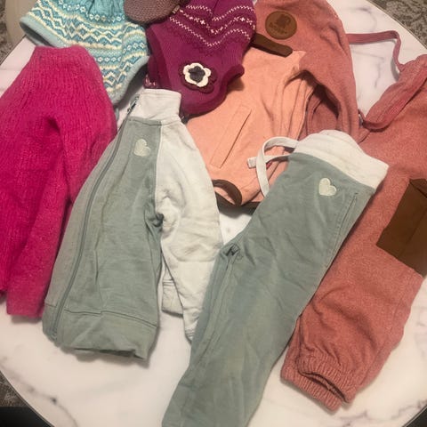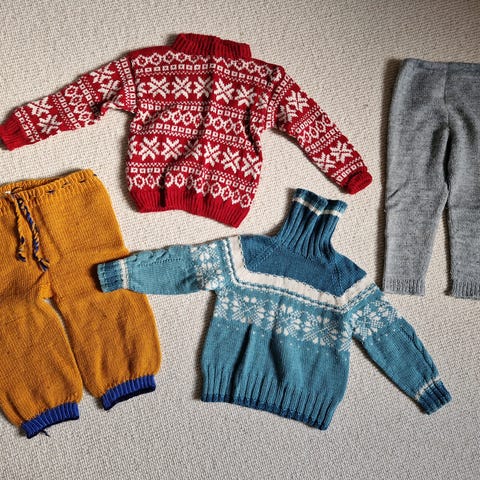 Har lagt med hjemmestrikket ullsokker, ullvotter og ett par bomullsluer.