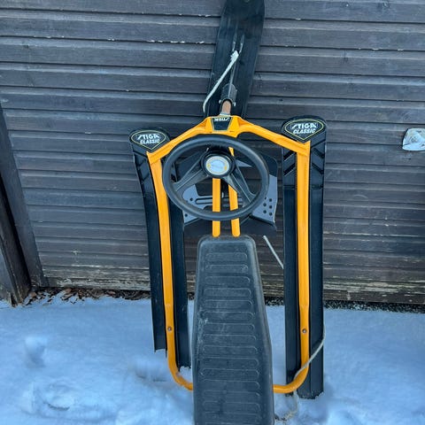 VN Snowracer Snowracer for barn med hvit ramme og svart sete. Utstyrt med styrehåndtak med skumgrep og skinner for snøunderlag. Egnet for barn og vinteraktiviteter på snø.