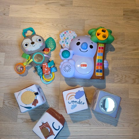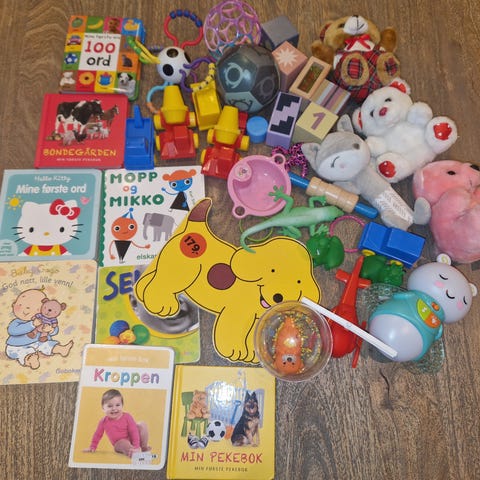 Den ene boken for magetrening er godt brukt. De andre er mye mindre brukt. Lammet har biteringer og bjelle.