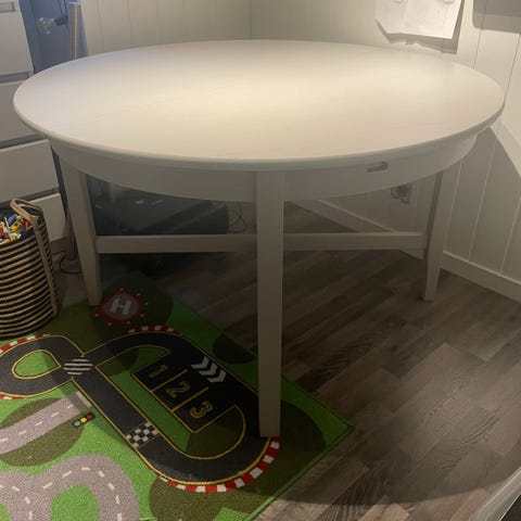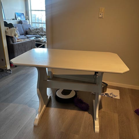 Heltre hvitt kjøkkenbord fra Ikea. Godt brukt. Funksjonelt og praktisk.Er 40 cm ileggplate under bordplaten. Må hentes av to. Ev også demontere beina. Samt to enkle hvite kjøkkenstoler
