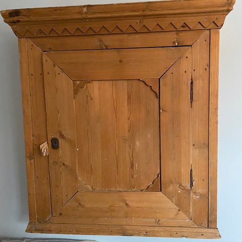 Antikk rustikk skap i tre med to dører og skuffer