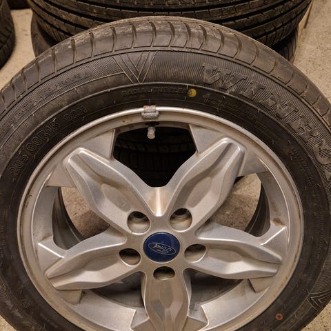 16’ komplette hjulsett til salgs. 215/60 R16 Vredestein piggdekk med 7,2mm mønsterdybde på to av dekkene og 7mm på de to andre. Dekkene sitter på 16’ Originale Ford felger med boltsirkel 5x108