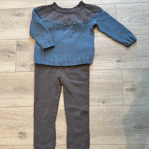 Kløfri hjemmestrikka ullsett str. 2-4 år med gravemaskiner.