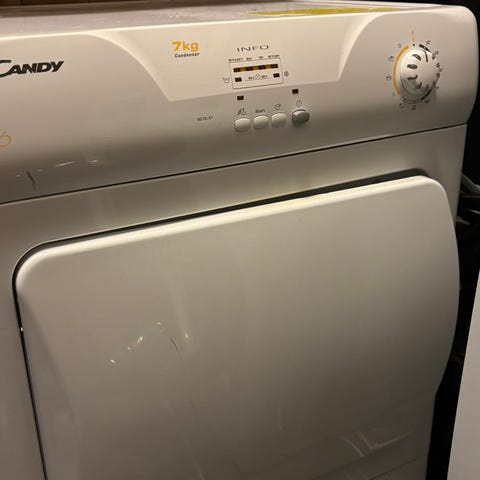 Candy Kondens Tørketrommel med kondensasjonsteknologi. Hvit farge og frontmatet design. Egnet for tørking av klær i hjemmet. Funker som den skal.