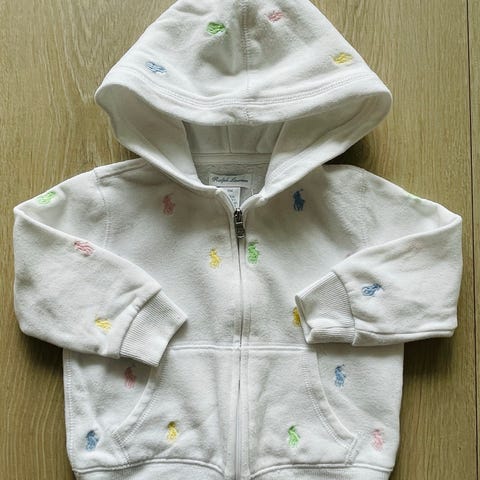 Ralph Lauren hettejakke for barn i størrelse 86, laget av bomull. Jakken er grå og designet for jente. Den har hette og glidelås foran, med karakteristisk Ralph Lauren-logo brodert på brystet.