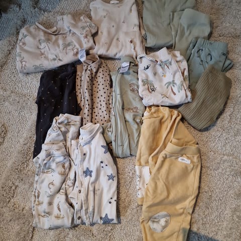 Pent brukte klær i størrelse 92. Pakken består av 2 bukser, 3 gensere og 2 body-trøyer. Ser nå at den blå gullkorn-genseren har en flekk på magen (se bilde), kanskje den kan skrubbes bort?❤️