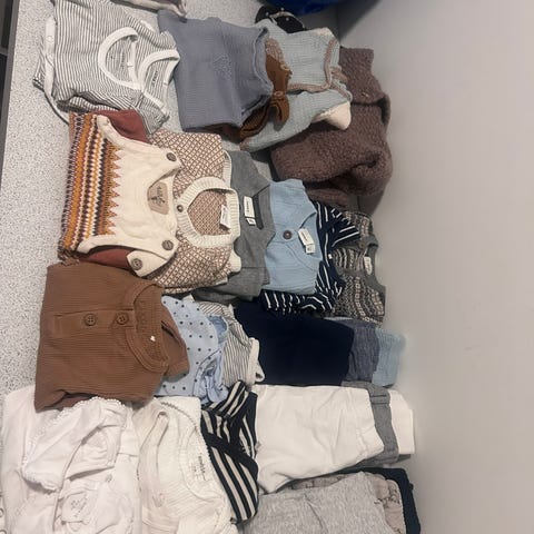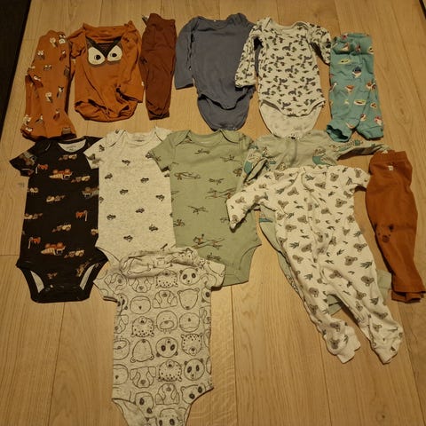 Klespakke str.74. Pent brukt. Blant annet plagg fra Lindex, HM, Cubus og Carter's. Selges fra et røykfritt og dyrefritt hjem.