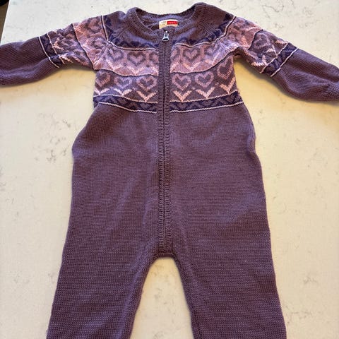 Vattert heldress til jente i str 74. I god stand og pent peikt, men mangler en knapp i hals linningen. Den er også sydd i skrittet på ene siden da ene trykk knappen er falt av.