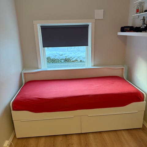 180*200 seng selges uten madrasser. Den har fire skuffer for oppbevaring . Lönset ribbebunn følger med. Bare ribbebunn koster 500kr på IKEA. Putene følger også med. Pris kan diskuteres. Skader på to steder som er på bilde.