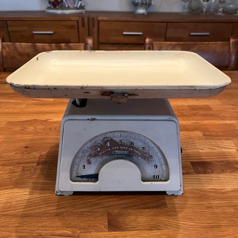 Mekanisk vekt med skala, laget av metall. Vekten har en buet skala med måleenheter og en bevegelig indikator for nøyaktig veiing. Passer til generelle bruk der vekting av små til mellomstore gjenstander er nødvendig.