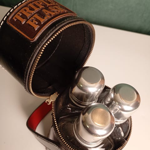 Settet inneholder tre separate glassflasker med skrukork, perfekt til sprit eller likør. Flott til tur, jakt, hyttetur eller som en morsom retro-detalj i barskapet.