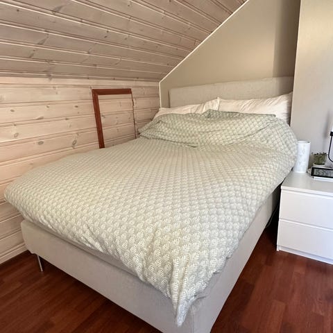 Selger kunn senga uten madrass. Du må ha egen madrass på 160x200