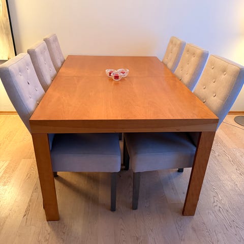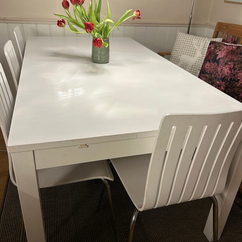 Fint og praktisk spisebord selges da vi har behov for et større bord. Bordet har to ileggsplater som kan lagres under bordplaten. Platene er ca. 33 cm brede.