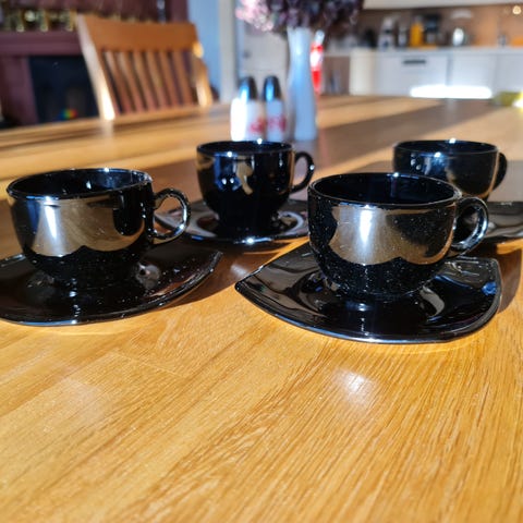 IKEA servise bestående av 9 middagstallerkener, 3 frokosttallerkener og 4 suppeskåler i svart keramikk. Serviset er godt brukt, men fortsatt mye bruk igjen.