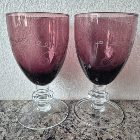 Vintage karaffel med seks matchende glass. Karaffelen og glassene har grønn farge med dekorative metallmønstre. Materialene inkluderer glass og metall. Settet kan brukes til servering av drikkevarer.